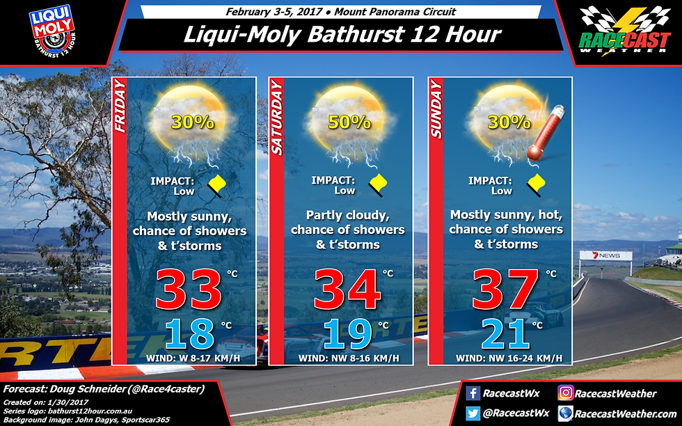 Through the weekend, the trough moves from north of Mount Panorama to the south. It is close enough each day to give at least a small chance of showers and thunderstorms each day, but Saturday appears to have the best chance as the trough will be closest to the track on that day. Rain could be heavy if a storm directly hits the track, but since coverage of storms is expected to be scattered, I have the impact at low right now. As the trough moves south of the track, it will also be getting hotter, with high temperatures reaching the upper 90s on Sunday. Bathurst, Australia is 16 hours ahead of EST, and 11 hours ahead of GMT. The race starts at 5:45 am local time Sunday, which is 6:45 pm Saturday GMT, and 1:45 pm Saturday EST. Here's the forecast in Celsius and km/h: